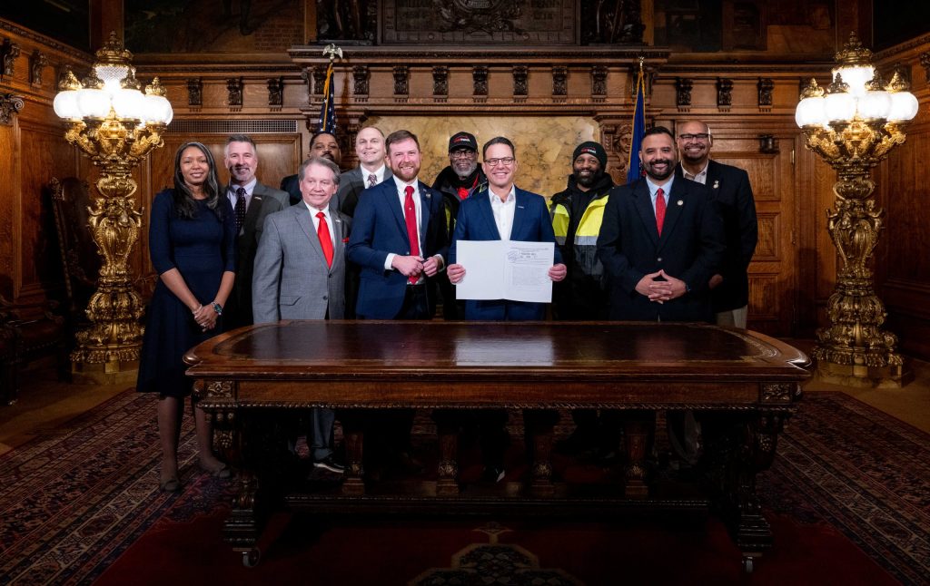Governor Josh Shapiro joined Rep. Nathan Davidson, Rep. Dave Madsen, Rep. Justin Fleming, and local transit leaders for a bill signing ceremony recognizing legislation that transfers ownership of a critical 3-acre parcel on Cameron Street. Also present were Eric Bugaile, SRTA Board Chairman; Board Members LaToya Winfield Bellamy (Dauphin County), Kirk Stoner (Cumberland County), and Jason Graves (City of Harrisburg); along with Shawn Willson, SRTA Bus Operator, and Larry Varner, SRTA Mechanic. The land transfer is a key milestone in advancing rabbittransit’s Capital Region Operations & Maintenance Facility and Transfer Center project, which will replace a 127-year-old facility and help modernize public transit in the Capital Region for generations to come.